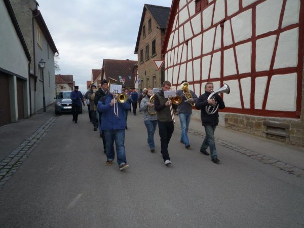 Dann werden wir in gemütlicher Runde durch den Steigerwald wandern. Die Schlapperflicker werden auf dem Ochsenwagen mitfahren und Musik spielen. Wir wandern über Järkendorf nach Eichfeld zur Zuckerscheune, wo wir einkehren (ca. 6 km Fußmarsch).